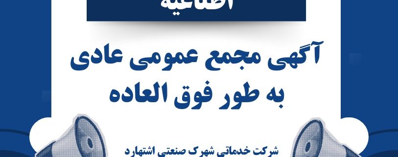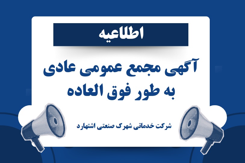 بدینوسیله به اطلاع کلیه اعضاء و صاحبان سهام شرکت خدماتی شهرک صنعتی اشتهارد (سهامی خاص) می رساند جلسه مجمع عمومی عادی به صورت فوق العاده (نوبت اول) در روز دوشنبه مورخ ۱۲ خرداد ۱۴۰۴ راس ساعت ۱۱:۰۰ لغایت ۱۲:۳۰ در محل شهرک صنعتی اشتهارد- بلوار ابوریحان- نبش حافظ شرقی- ساختمان فناوری و کسب و کار آیت الله هاشمی رفسنجانی- طبقه همکف- سالن اجتماعات- کدپستی ۳۷۸۸۱۱۳۳۶۶ تشکیــل می گردد.